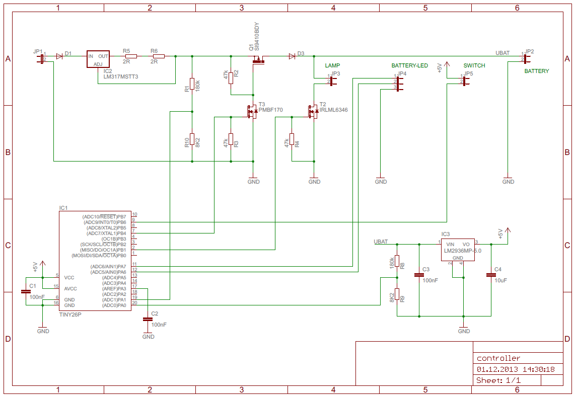 Die Ladeelektronik ist ausgelegt für ein 24V Netzteil mit mindestens 12W Leistung. Die Schaltung wird durch D1 gegen Verpolung geschützt. IC2 ist ein klassischer LM317 in Konstantstromschaltung. Der Strom wird durch R5 und R6 definiert. In Serie geschalten ergeben ihre 4Ω einen maximalen Strom von rund 300mA (1.25V / 4Ω = 0.32A) R1 und R10 bilden einen Spannungsteiler dessen Mittelpunkt zu einem ADC-Eingang des Prozessors führt. Damit wird detektiert, ob ein stromführendes Ladegerät angesteckt ist.