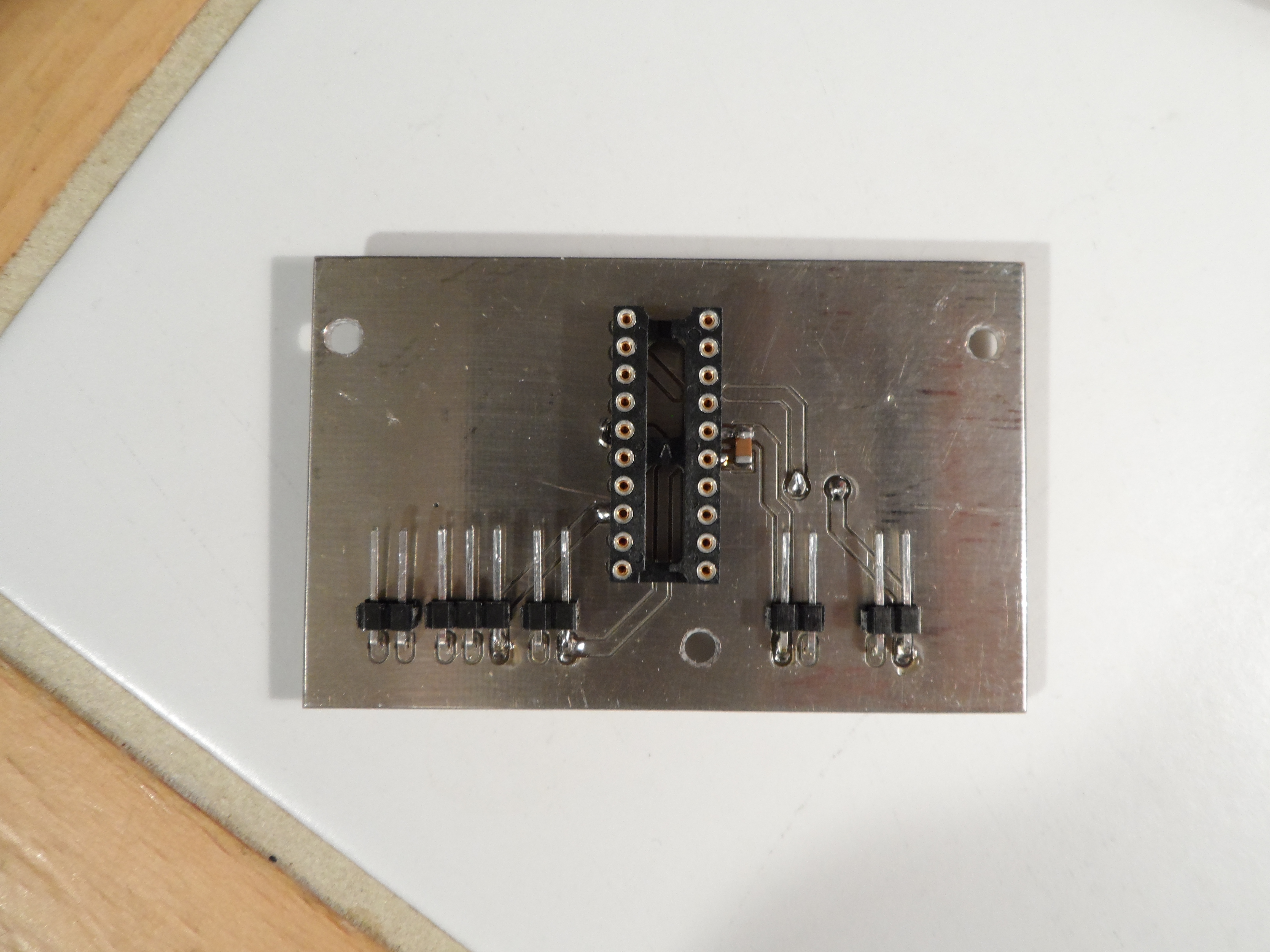 Obere Seite: zu sehen sind der Prozessorsockel und die Anschlüsse für Akku, Taster, LED, Akku, Ladekabel.