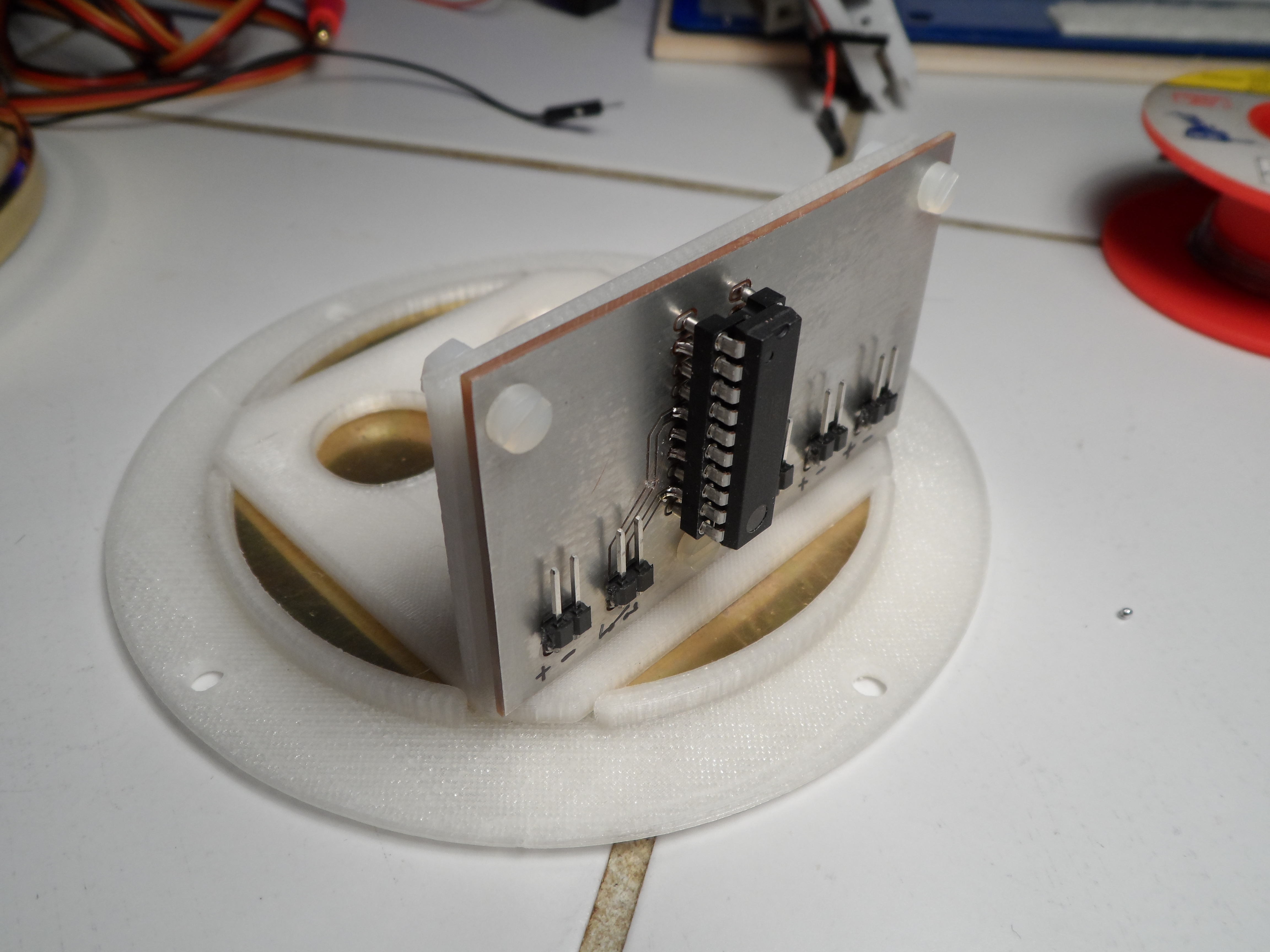 Der Halter für die Elektronik ist im 3D Druck entstanden. Er wird in den Montagering eingeklebt, der auch den ausgefrästen Deckelboden aufnimmt.