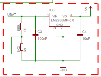 Die Spannung vom Akku wird mittels IC3 auf 5V reguliert. R8 und R9 bilden einen Spannungsteiler, dessen Wert an einen ADC-Eingang des Prozessors geführt wird. Er ermittelt damit die aktuelle Spannung des Akkus.