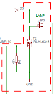 MOSFET Transistor T2 schaltet die Lampe ein und aus.