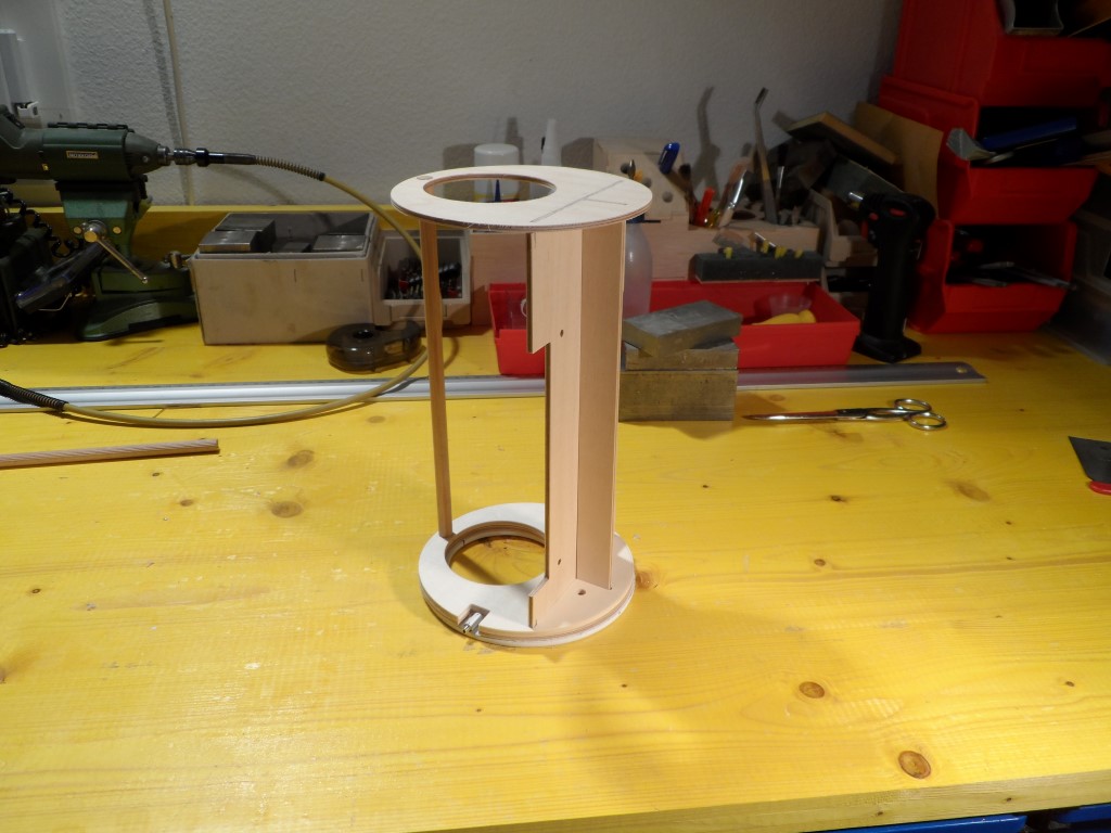Der Sockel wurde um eine CNC-gefräste Holzkonstruktion erweitert, die das Netzteil trägt und die Basis für das Rohr mit den LEDs bildet.