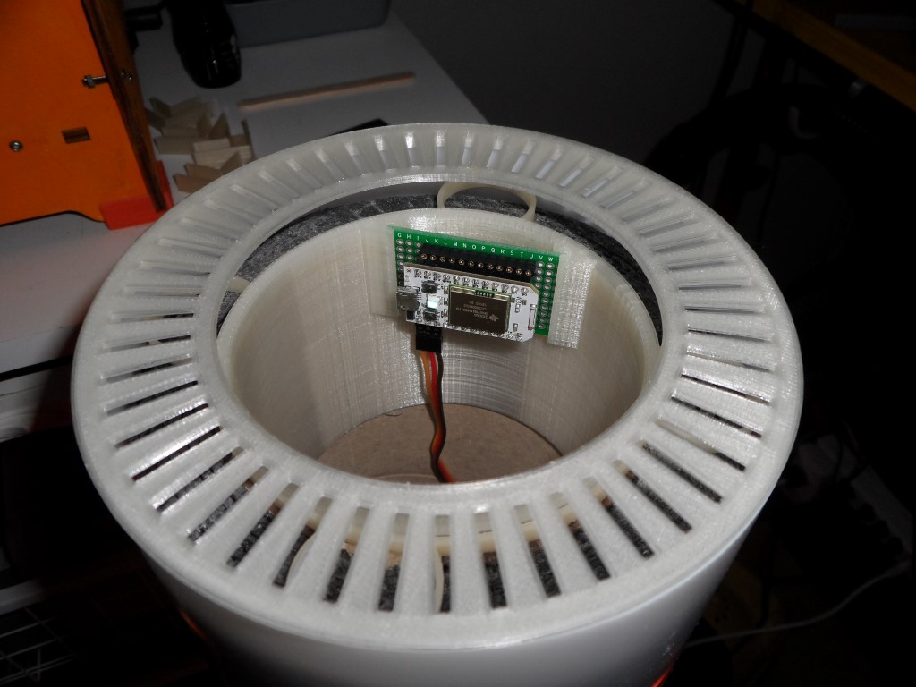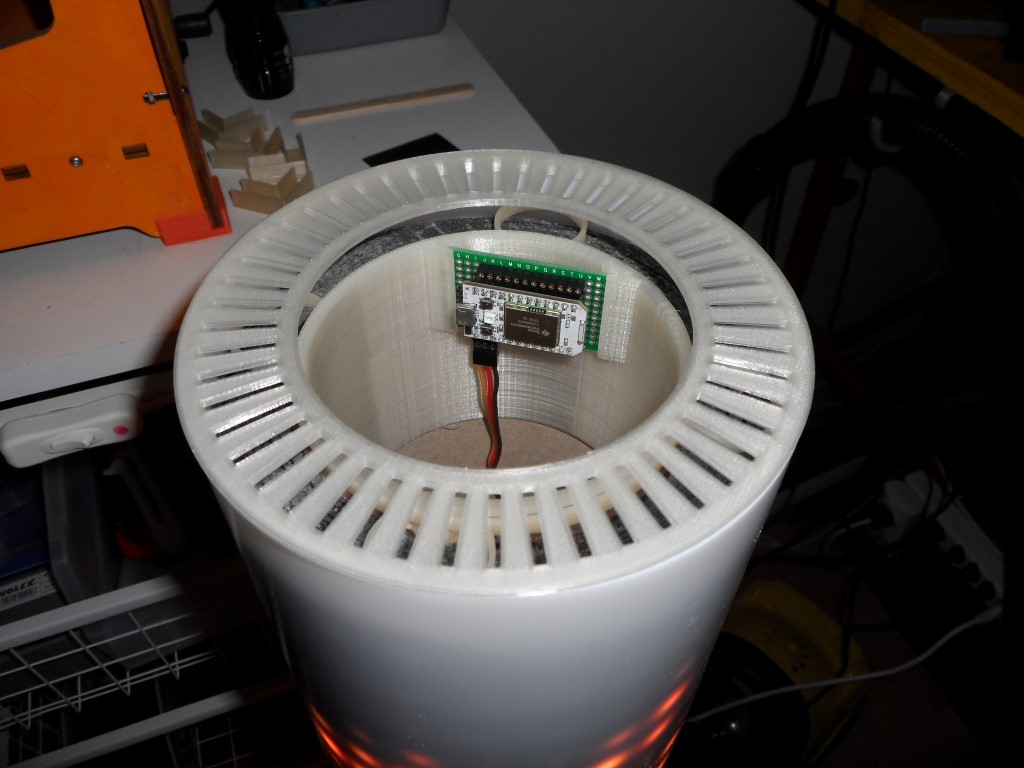 Zu meinem Glück verkauft die Migros in der Sparte Micasa eine passende Lampe mit einem Durchmesser von 150mm und ca. 1.6m Höhe. Der Preis von CHF 150 ist zwar deftig, jedoch ist darin auch gleich ein metallener Sockel enthalten. Die Länge des Rohres war zu lang und wurde entsprechend gekürzt. Der Deckel, die Halterung des Lüfters und des Controllers wurde mittels eines 3D-Druckers hergestellt. Hier zeigt sich dessen Überlegenheit beim Konstruieren um Sonderformen in Kürze herzustellen.